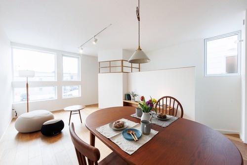 22帖超の2Fリビングには内窓でつながる書斎スペース、壁付けキッチン+作業台でつくる"キッチンスタジオ"があります。