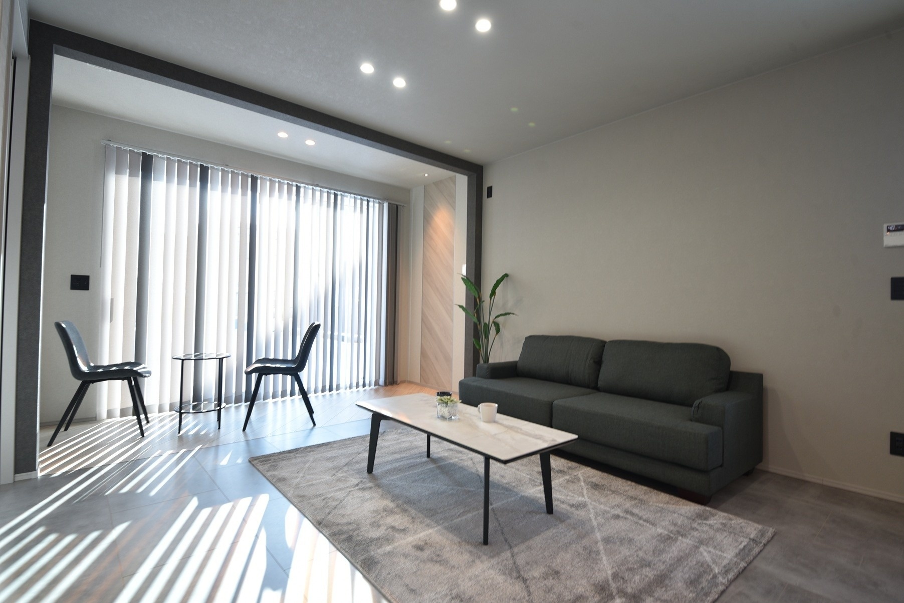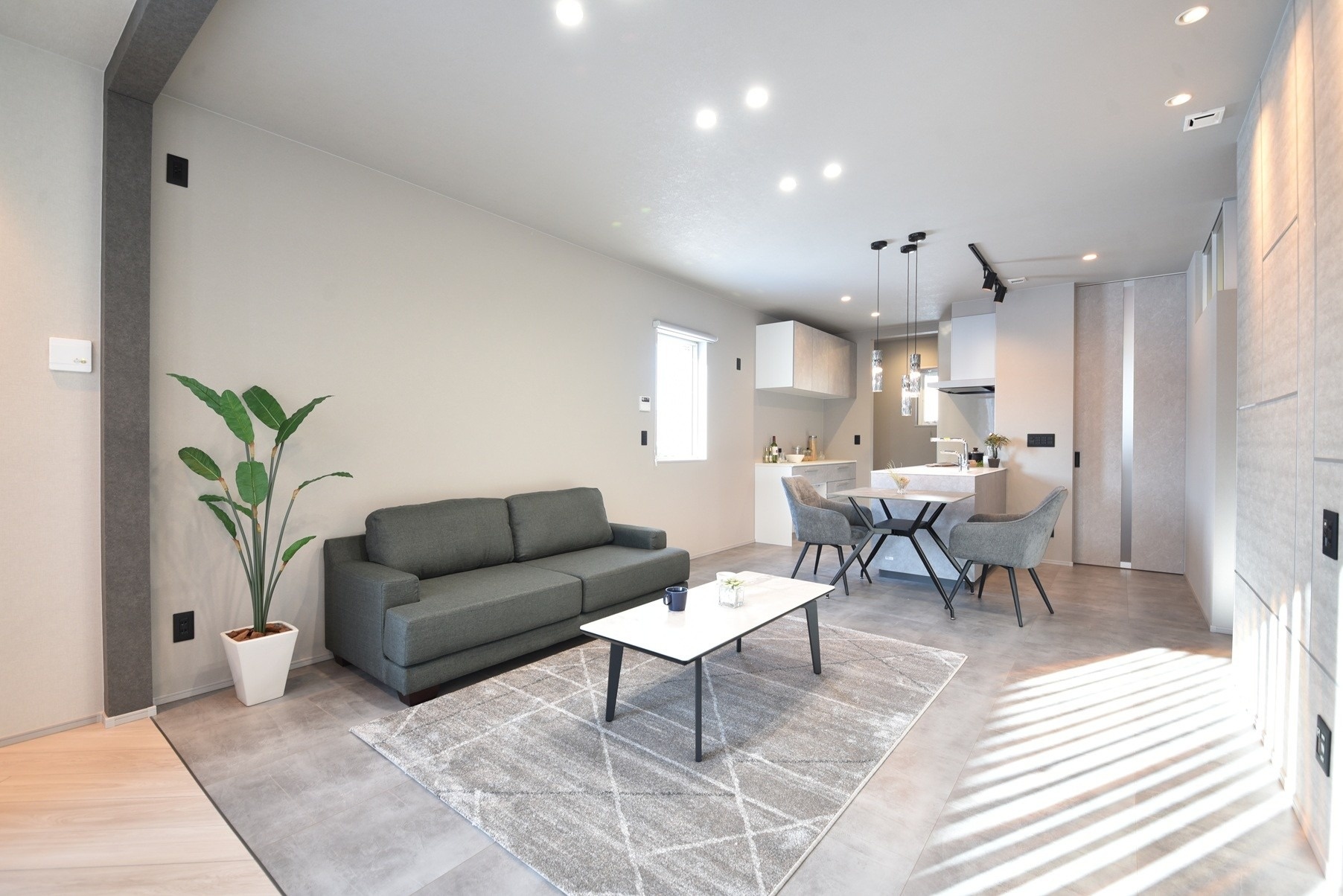 玄関を抜けた先に広がるのは、落ち着いたリビング。 大開口の窓から差し込む柔らかな光が、室内の陰影を美しく際立たせ、 時間の流れさえもゆるやかに感じさせます。夫婦が語らい、静かにくつろぎ、 時にはそれぞれの思索にふける そんな豊かな時間が自然と生まれる空間です。