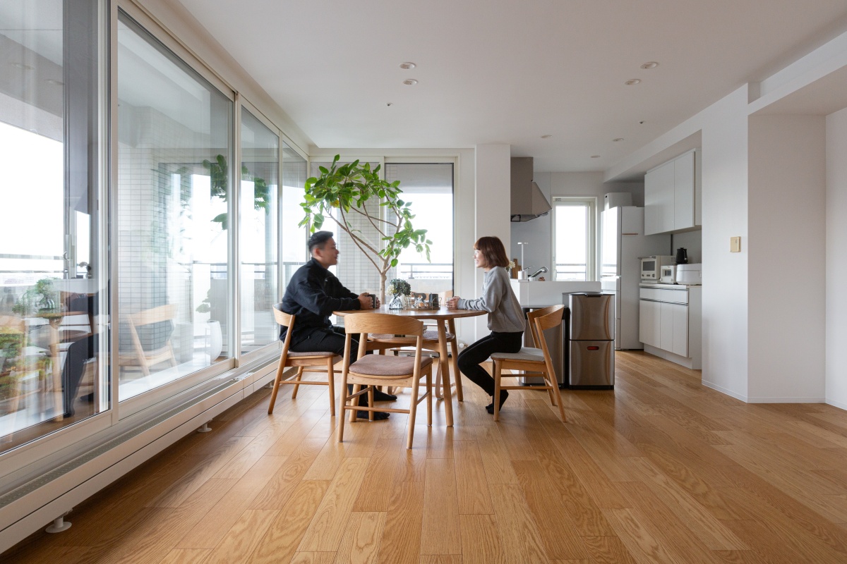 特に好評なのが、好みのデザインテイストで提案するインテリアプラン。制限のあるマンションの間取りを大胆に変更し、機能性とデザイン性を両立させながら唯一無二の空間に仕上げます。また、内窓を付ける2重サッシ工事や、エアコンの設置など、デザインの良さに加え、性能向上と快適性を追求した提案が、その後の暮らしやすさにつながっています。